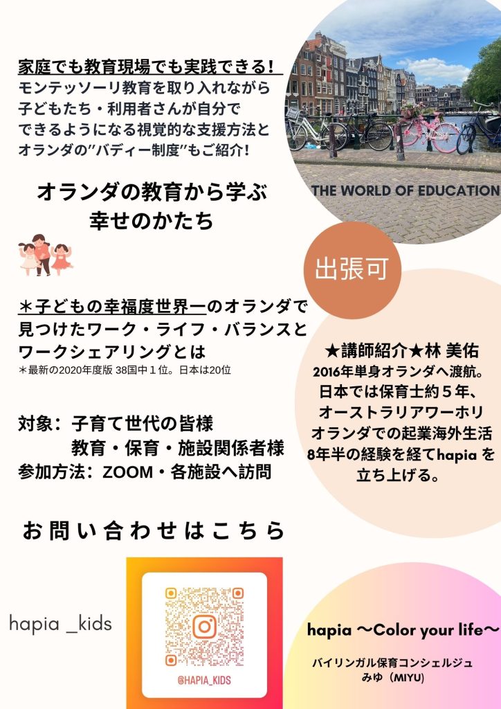 子どもの幸福度世界一のオランダから学ぶ。教育・保育・施設の関係者様への講演会・ワークショップを受け付けております。